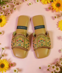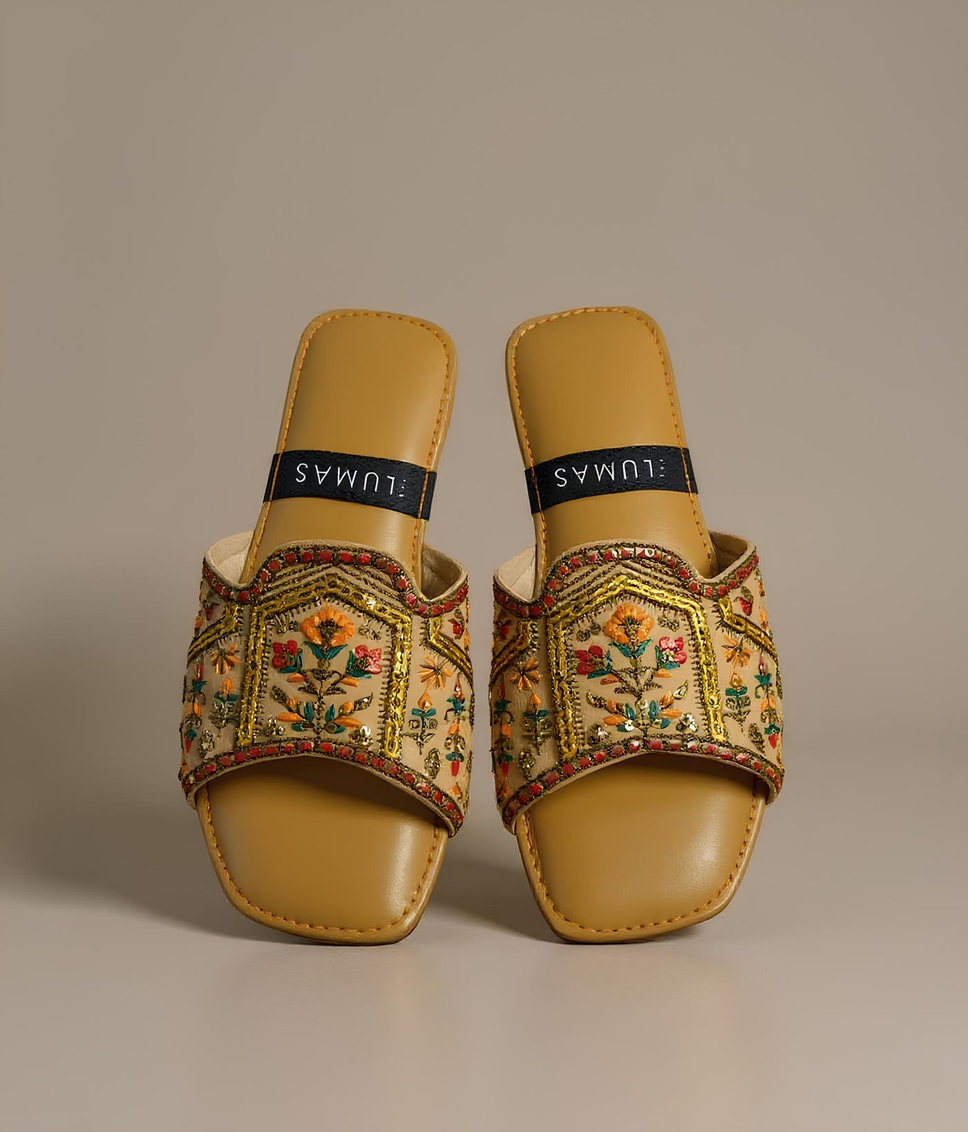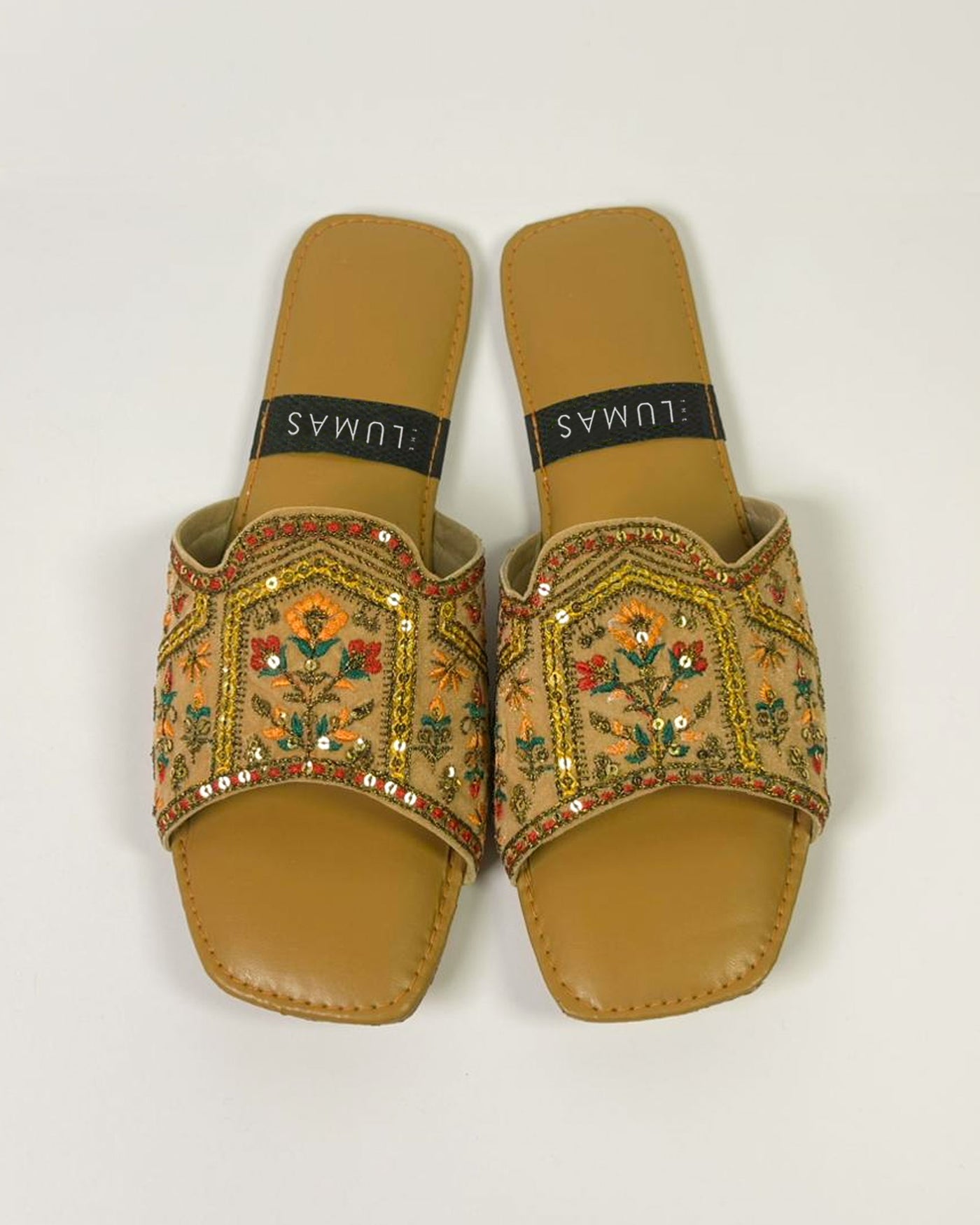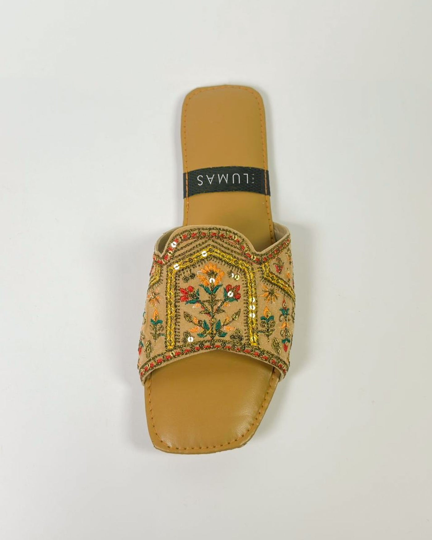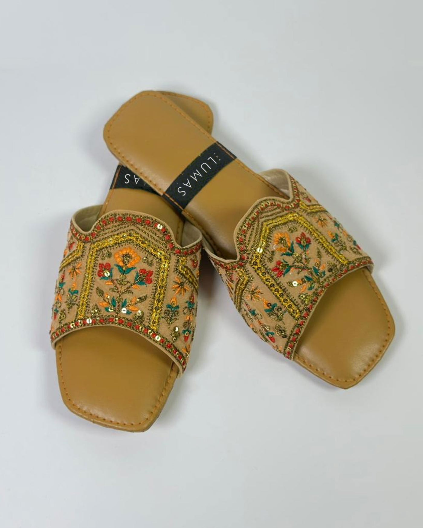 Radiant as the morning sun, Solmira embodies the art of effortless elegance. Handcrafted with intricate golden embroidery and delicate sequins, this LUMAS slide captures heritage in every detail. Its warm tones and floral patterns evoke timeless charm — a perfect blend of comfort, culture, and quiet luxury.