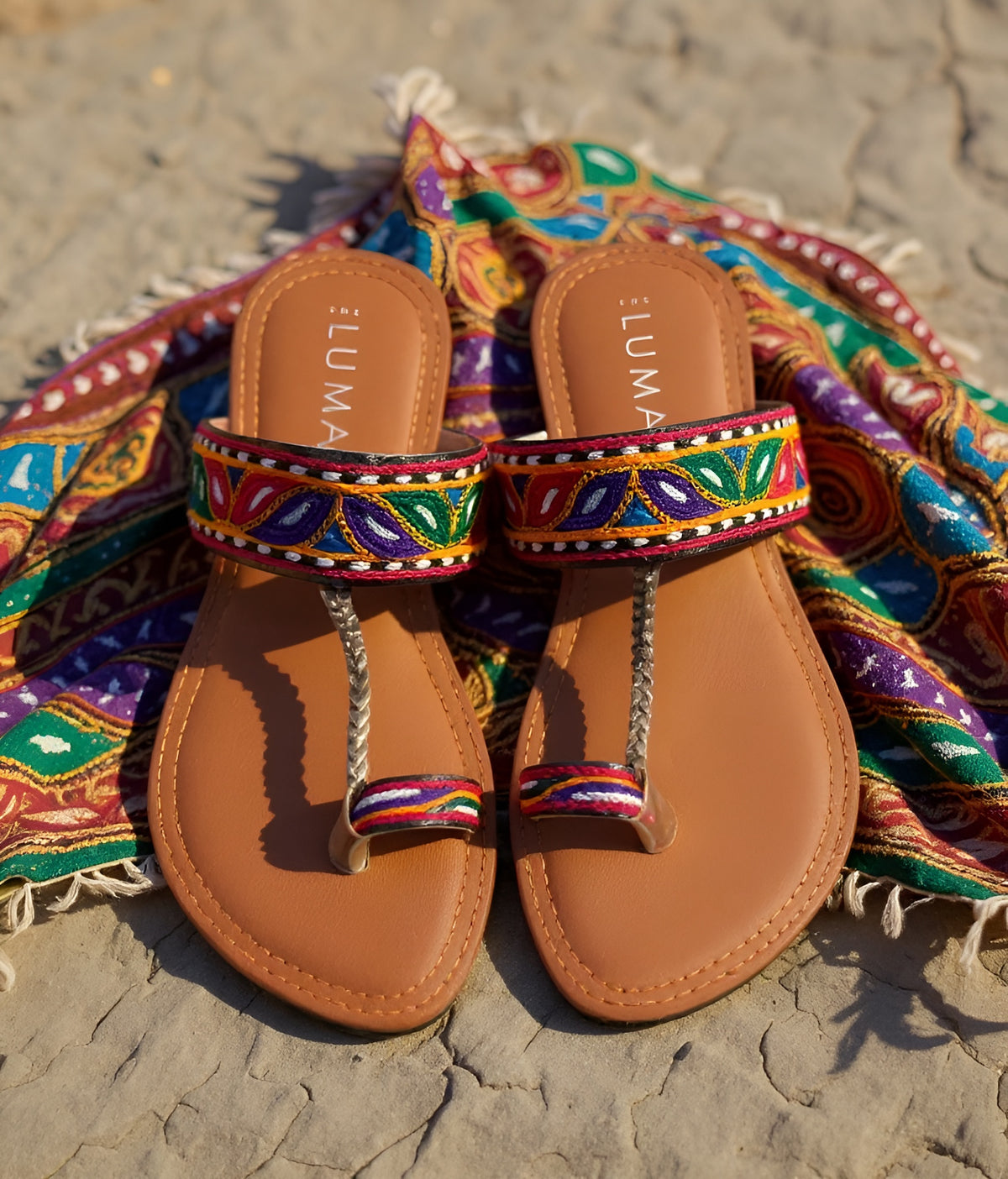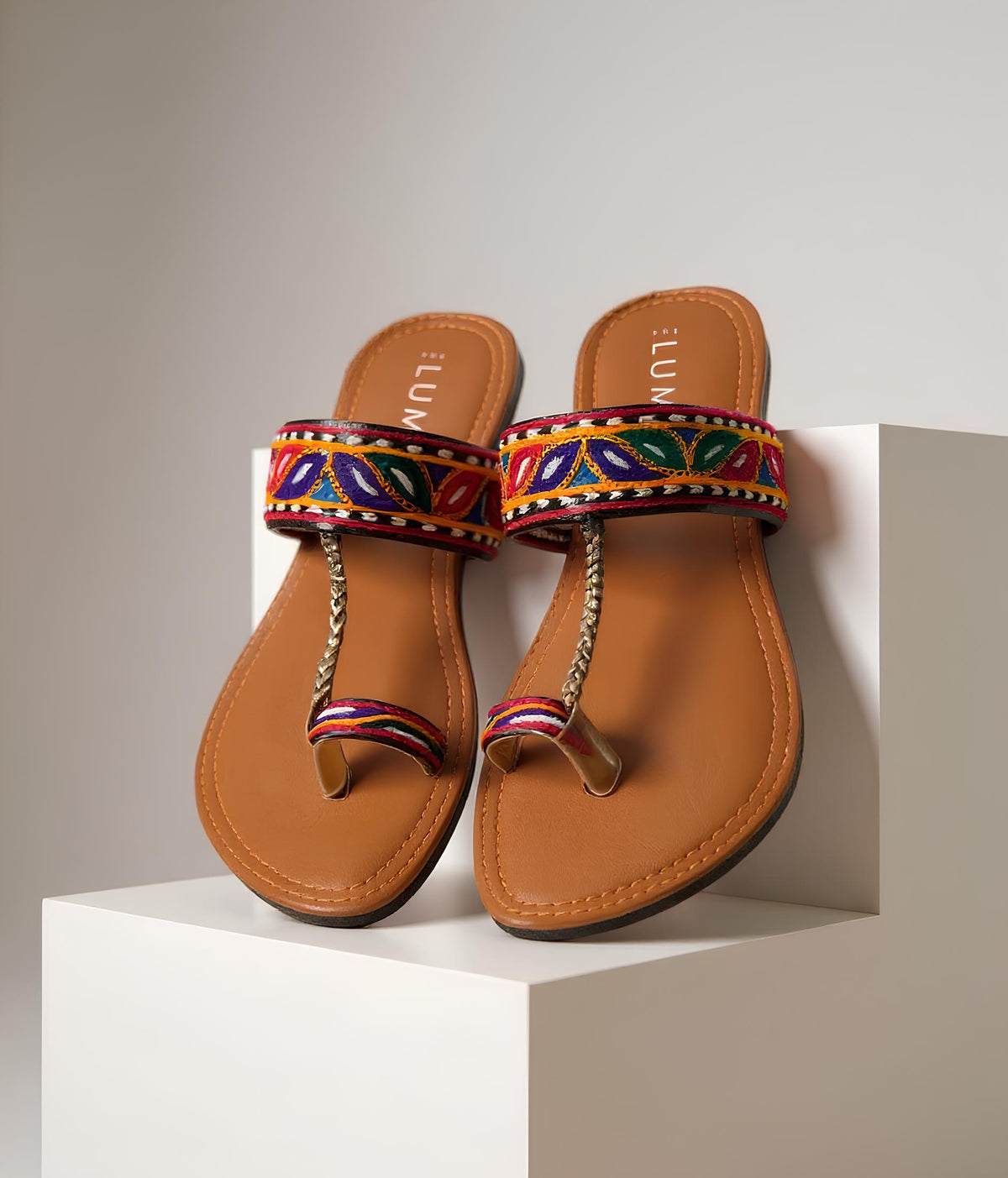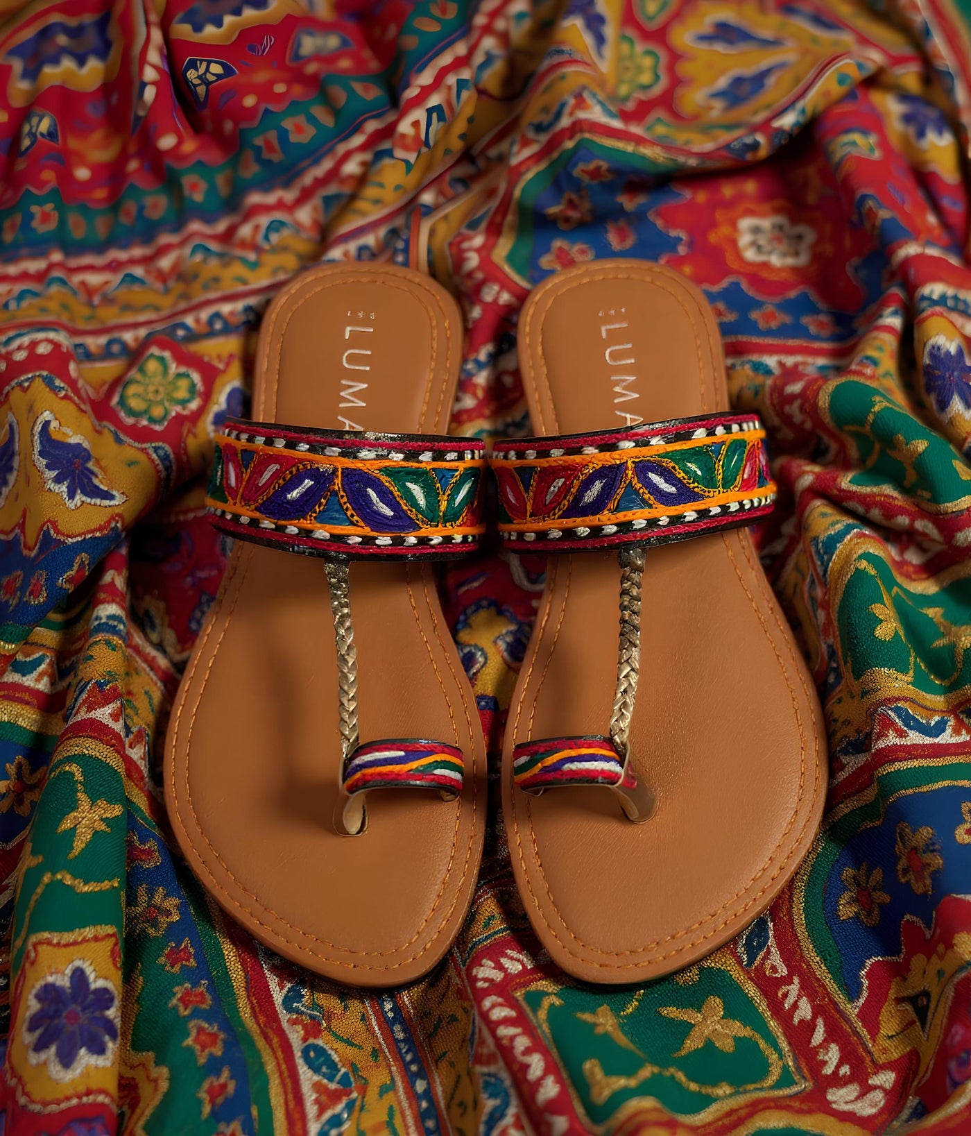Step into tradition with Leela, a pair of sandals designed to bring color and elegance to your look. Featuring vibrant embroidery in hues of red, yellow, and blue, paired with a classic brown base, these sandals offer the perfect blend of ethnic charm and modern comfort. Whether you're attending a wedding, festival, or just want to add a playful touch to your everyday look, Leela will make your feet the center of attention.