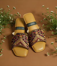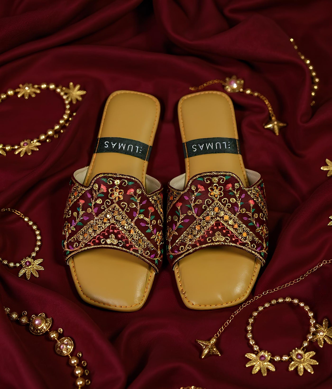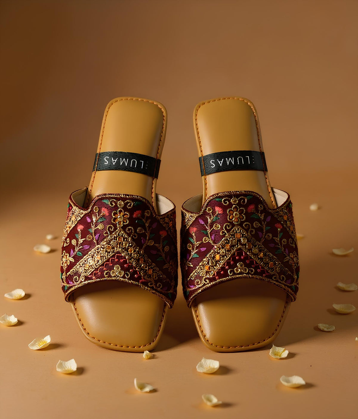 Step into elegance with Mehreen Dark, a perfect blend of tradition and style. Handcrafted with intricate embroidery in rich golden and maroon tones, this pair embodies timeless charm. Designed on a soft leather sole for all-day comfort, its open-toe cut adds a modern edge while staying rooted in heritage. Ideal for festive occasions, weddings, or elevating your everyday look, Mehreen Dark is where sophistication meets culture.