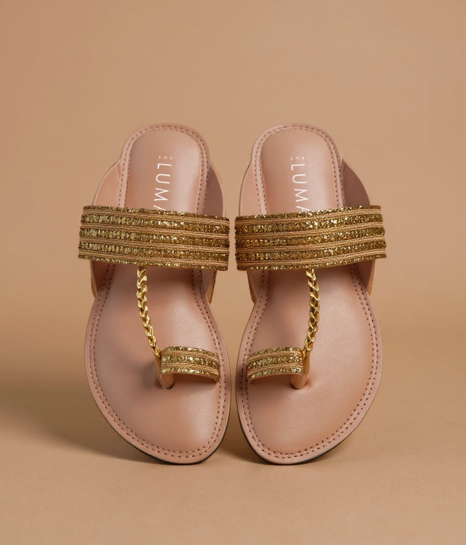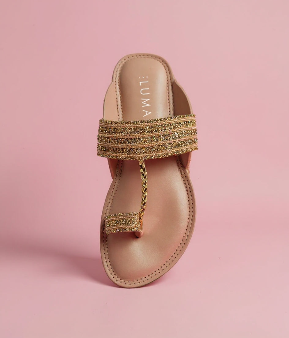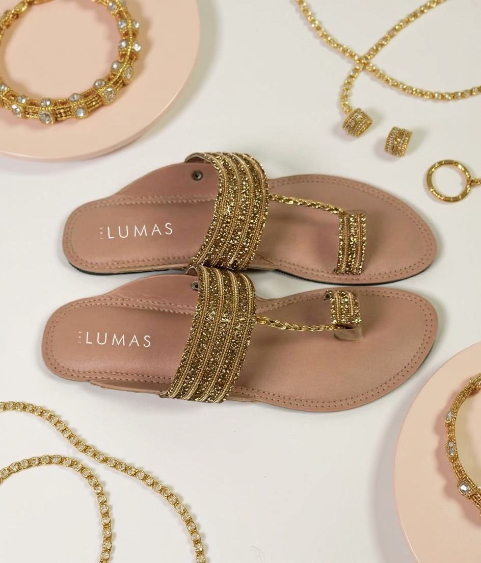 Step into sophistication with Shanaya, the perfect blend of elegance and modern design. Adorned with shimmering gold embellishments, these sandals elevate your look with their intricate detailing and graceful fit. Perfect for weddings, festive occasions, or a chic evening out, Shanaya promises comfort without compromising on style.